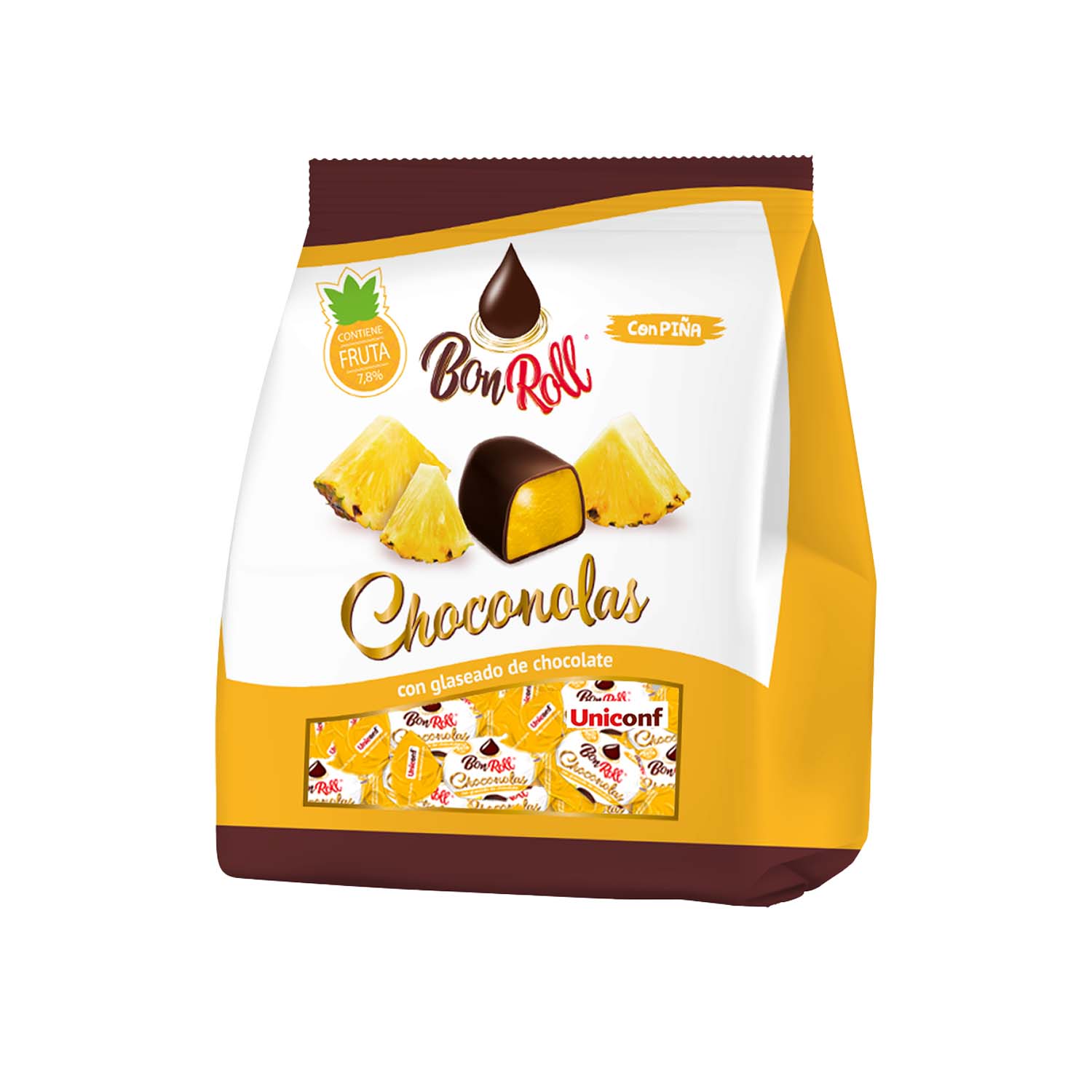 Zutaten: Zucker; Glukosesirup; Schokoladenglasur (21%) (Zucker, Kakaomasse, Kakaobutter, Emulgator: Sojalecithin, Aroma); Apfelpüree (3,9%); Ananassaft (3,9%); Feuchthaltemittel: Glycerin; Geliermittel: Pektin; Säureregulatoren: Natriumcitrat, Citronensäure; Aroma: Ananas; Farbstoff: gelb. Kakaogehalt in Schokolade: 52%