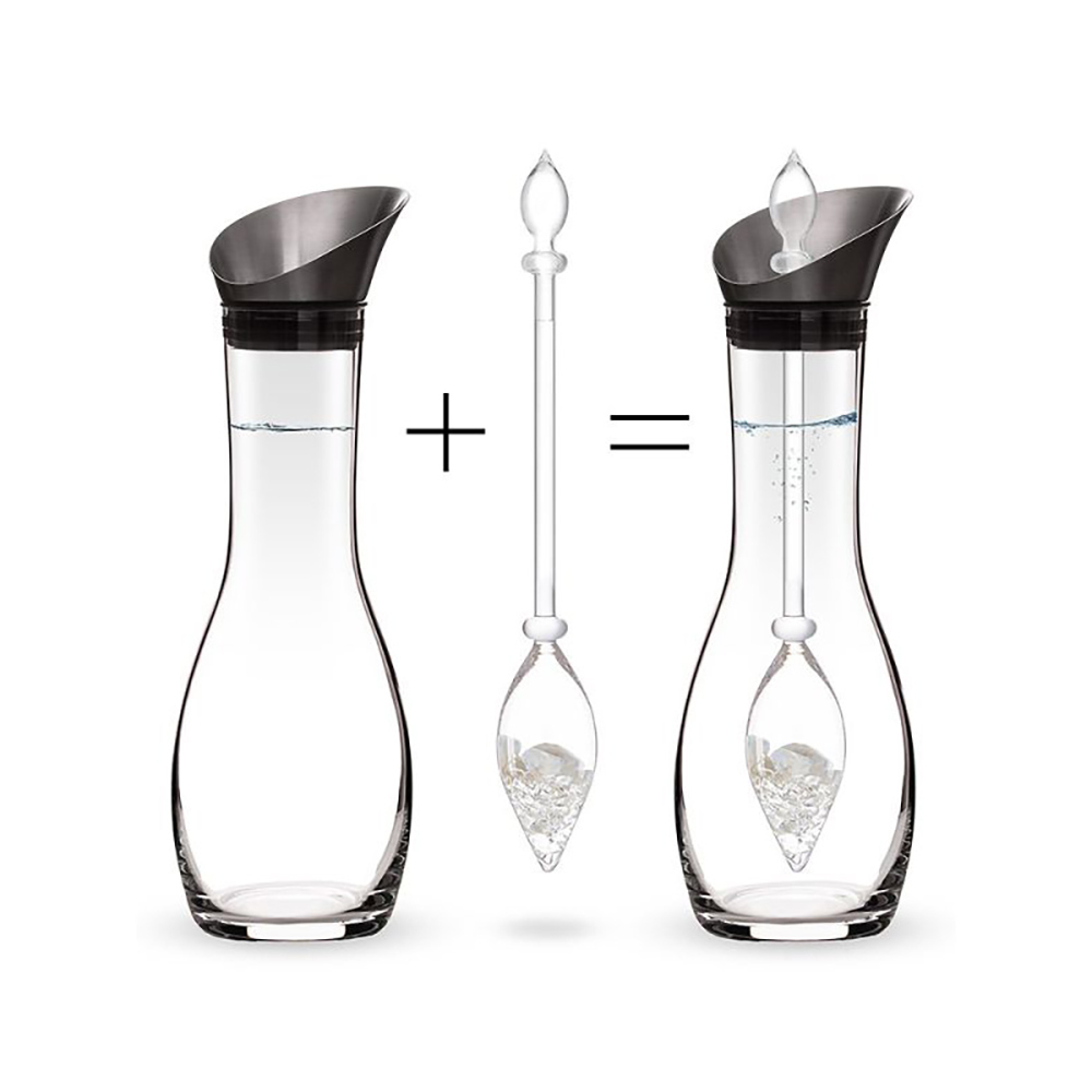 Genau so sollte das Wasser genossen werden! Vergessen Sie die gewöhnlichen Plastikkrüge und gönnen Sie sich das Vergnügen, aus einer eleganten Glaskaraffe mit einer glanzvollen, mit wertvollen Kristallen gefüllten Phiole zu trinken!Dieses exklusive Set, bestehend aus Glaskaraffe und Edelsteinphiole, ist perfekt, um Dein Wasser stilvoll zu beleben. Unsere Edelsteinmischungen basieren auf altbewährten Traditionen. Jeder Edelsteinstab wird aus hochwertigem, schadstofffreiem Glas von Meisterhand in einem aufwendigen und patentierten Herstellungsverfahren mundgeblasen. Gefüllt werden die Glasstäbe ausschließlich mit fair gehandelten, handverlesenen und sorgfältig gereinigten Edelsteinen. Zuverlässig und scheinbar schwebend wird er von der außergewöhnlichen Glaskaraffe gehalten.