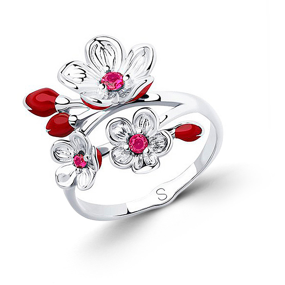 Sokolov Damenring aus 925 Silber mit Rubin und Emaille Gr-20mm