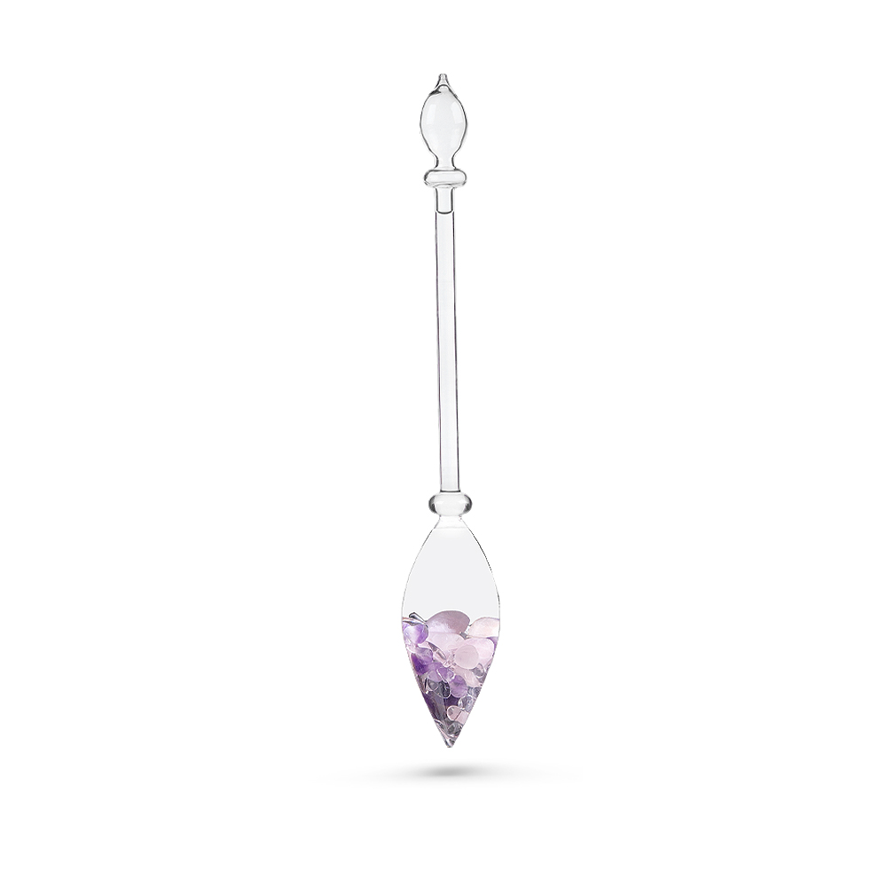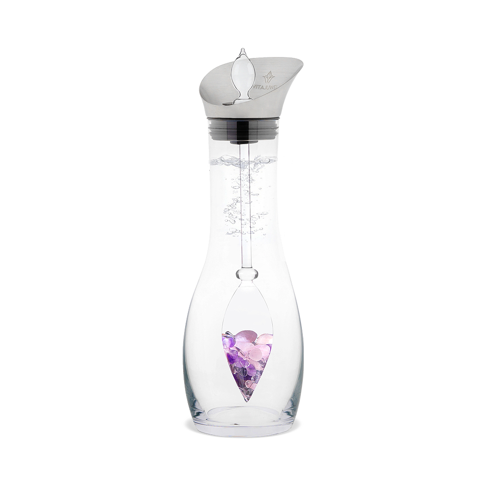 - Material: Glas, Edelstahl, Silikon, Edelsteine (Amethyst, Rosenquarz & Bergkristall)