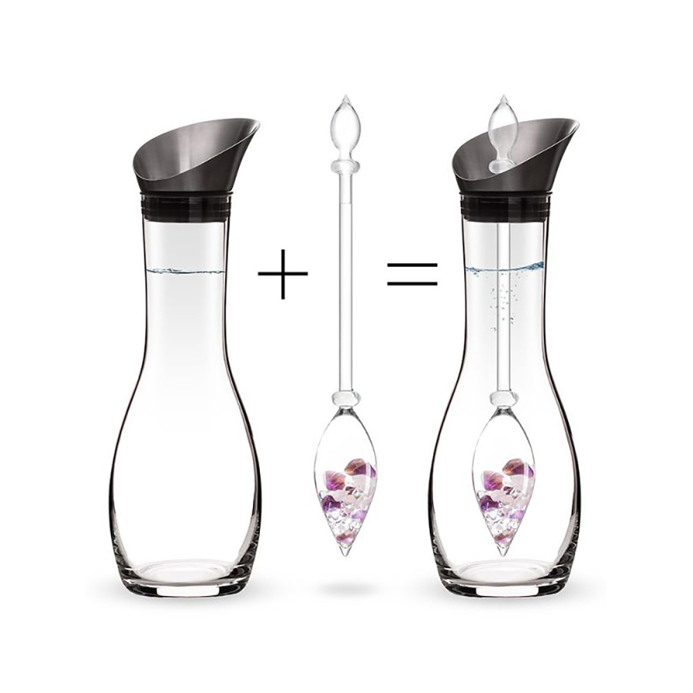 Genau so sollte das Wasser genossen werden! Vergessen Sie die gewöhnlichen Plastikkrüge und gönnen Sie sich das Vergnügen, aus einer eleganten Glaskaraffe mit einer glanzvollen, mit wertvollen Kristallen gefüllten Phiole zu trinken!Dieses exklusive Set, bestehend aus Glaskaraffe und Edelsteinphiole, ist perfekt, um Dein Wasser stilvoll zu beleben. Unsere Edelsteinmischungen basieren auf altbewährten Traditionen. Jeder Edelsteinstab wird aus hochwertigem, schadstofffreiem Glas von Meisterhand in einem aufwendigen und patentierten Herstellungsverfahren mundgeblasen. Gefüllt werden die Glasstäbe ausschließlich mit fair gehandelten, handverlesenen und sorgfältig gereinigten Edelsteinen. Zuverlässig und scheinbar schwebend wird er von der außergewöhnlichen Glaskaraffe gehalten.