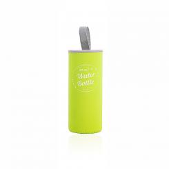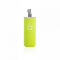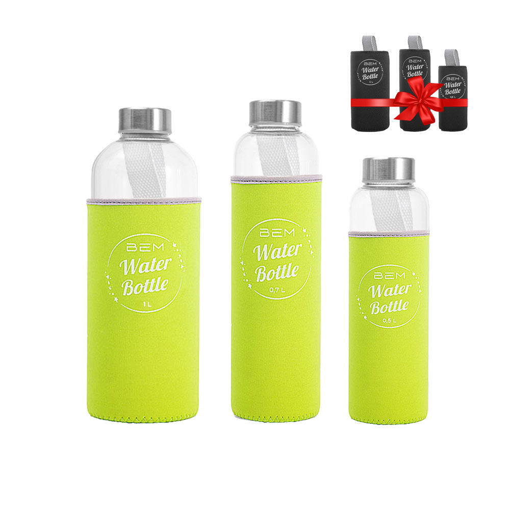 BEM Water Bottle-SET: 3xTrinkflaschen in drei Größen aus Borosilikatglas mit Edelstahldeckel, je in schwarzer Hülle + ein Hüllen-Set in GRÜN