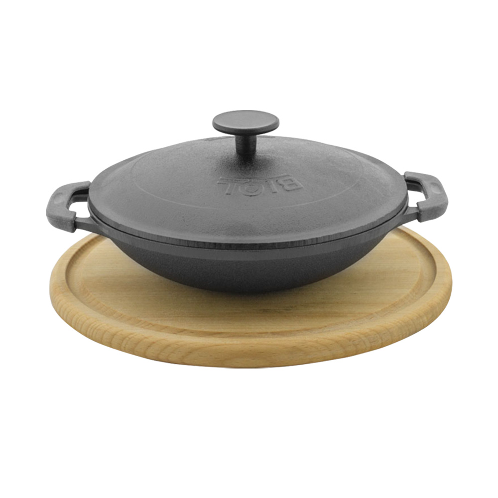 BIOL Gusseisen Servierwok Ø 14 cm, mit Deckel und Holzbrett