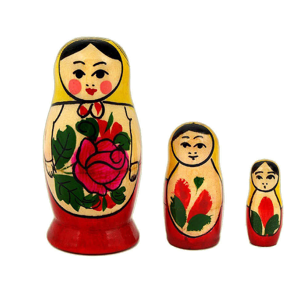 Eine handbemalte Matrjoschka aus Holz mit drei Puppen: alle außer der Kleinsten können geöffnet und ineinander gesteckt werden.Hinweis: