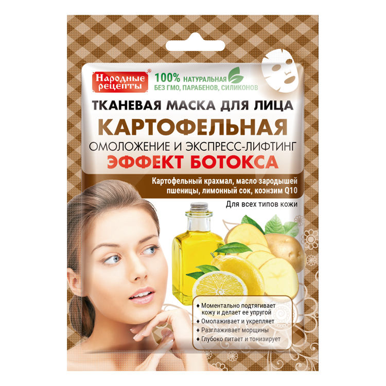 Eine moderne, natürliche Tuchmaske auf der Basis von Kartoffelstärke mit Coenzym Q10, die eine "Botox"-Wirkung hat: Sie reduziert die Falten, strafft und festigt die Haut und modelliert das GesichtsovalEIgenschaften: