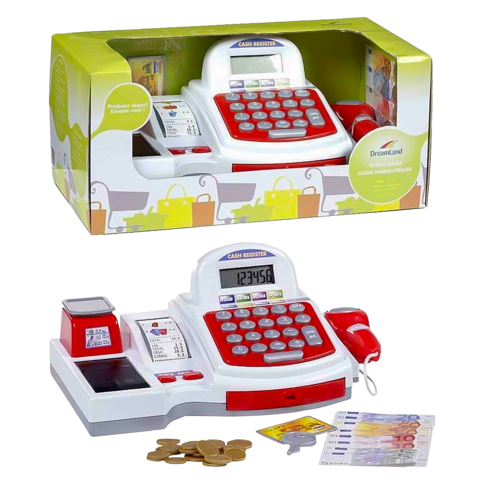 Die Spielzeugkasse ist mit einem Scanner und Kassenbonn Rolle ausgestattet