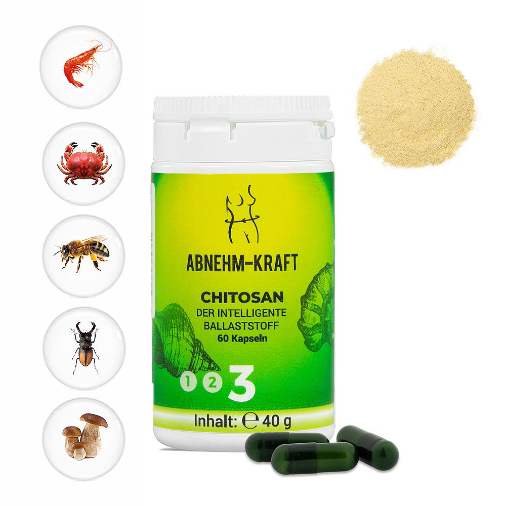 Chitosan ist ein natürlich vorkommendes Polyaminosaccharid, das in vielen Pflanzen und Pilzen vorkommt. Außerdem ist es auch Bestandteil des Chitin-Panzers von Meerestieren wie Krebsen und Krabben und gehört als Faserstoff zur Klasse der Ballaststoffe. Wegen seiner besonderen Eigenschaften wird Chitosan gerne in Nahrungsergänzungen und Medizinprodukten verwendet.Zusammensetzung/Kapsel: Chitosan (79 %), Kapsel (Gelatine, Farbstoff Titandioxid), Ascorbinsäure (C) (3,95 %), Maisstärke, Thiaminmononitrat (B1) (0,10 %), Pyridoxin (B6) (0,10 %), Riboflavin (B2) (0,08 %), Pteroylglutaminsäure (Folsäure), Cyanocobalamin (B12)