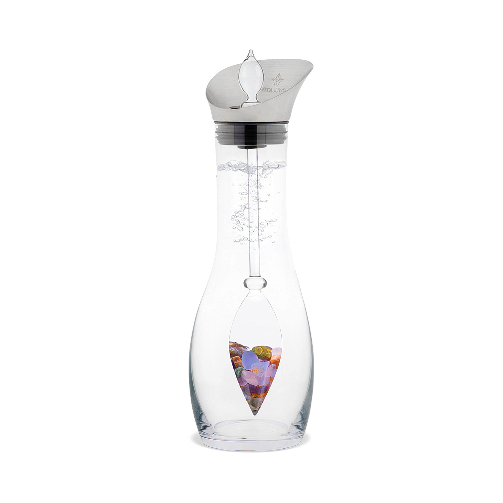 Genau so sollte das Wasser genossen werden! Vergessen Sie die gewöhnlichen Plastikkrüge und gönnen Sie sich das Vergnügen, aus einer eleganten Glaskaraffe mit einer glanzvollen, mit wertvollen Kristallen gefüllten Phiole zu trinken!Dieses exklusive Set, bestehend aus Glaskaraffe und Edelsteinphiole, ist perfekt, um Dein Wasser stilvoll zu beleben. Unsere Edelsteinmischungen basieren auf altbewährten Traditionen. Jeder Edelsteinstab wird aus hochwertigem, schadstofffreiem Glas von Meisterhand in einem aufwendigen und patentierten Herstellungsverfahren mundgeblasen. Gefüllt werden die Glasstäbe ausschließlich mit fair gehandelten, handverlesenen und sorgfältig gereinigten Edelsteinen. Zuverlässig und scheinbar schwebend wird er von der außergewöhnlichen Glaskaraffe gehalten.