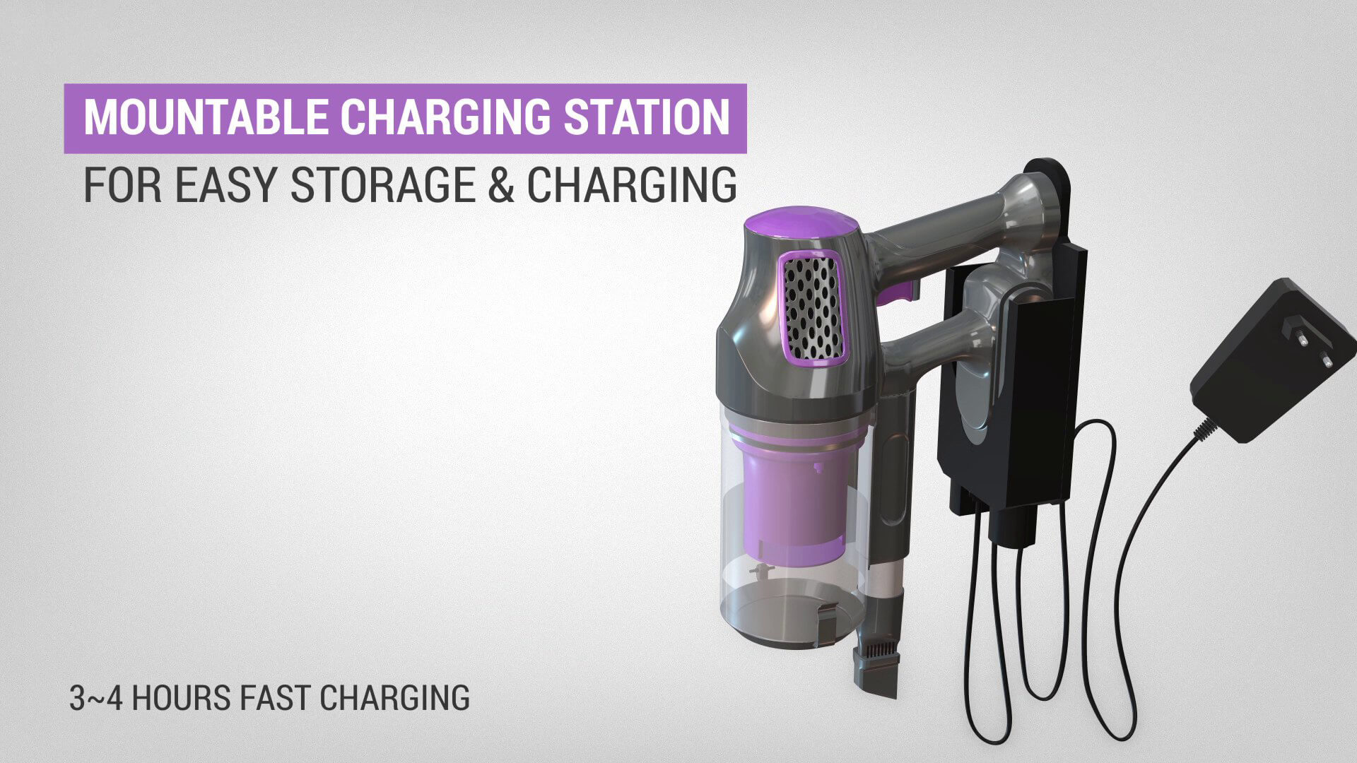 Dieser Handstaubsauger wird mit einer Ladestation geliefert, die einfach zu montieren ist, und verfügt über eine Schnellladefunktion für nur 3-4 Stunden.