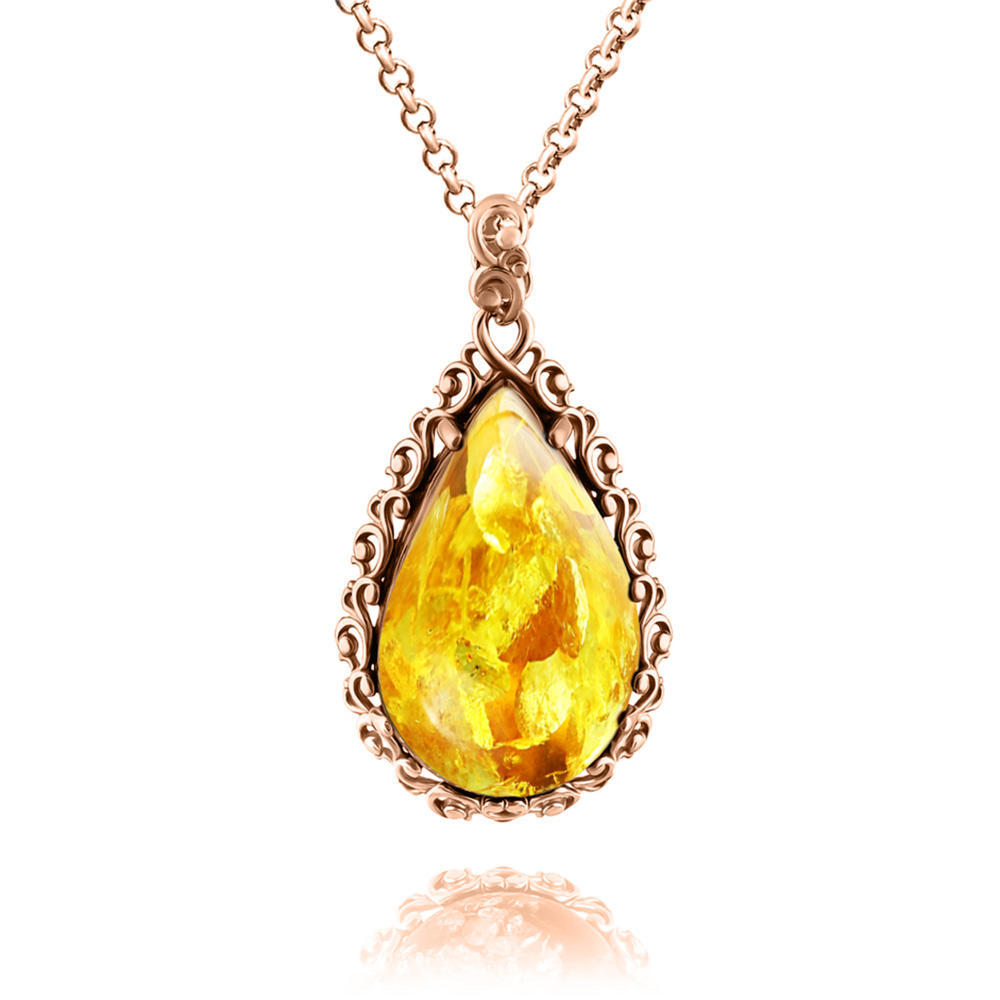 Tauchen Sie ein in die Welt zeitloser Eleganz mit diesem atemberaubenden Anhänger aus vergoldetem 925er Sterling Silber mit Lemon Bernstein. Das leuchtend goldgelbe Farbspiel des natürlichen Bernsteins erinnert an sonnige Sommertage und verleiht jedem Outfit einen Hauch von Wärme und Exklusivität.Der kunstvoll gearbeitete Anhänger besticht durch seine Tropfenform, die von einem filigranen Ornamentrahmen umschlossen wird. Das Zusammenspiel von glänzendem, vergoldetem Silber und dem faszinierenden Schimmer des Lemon Bernsteins macht dieses Schmuckstück zu einem wahren Blickfang.