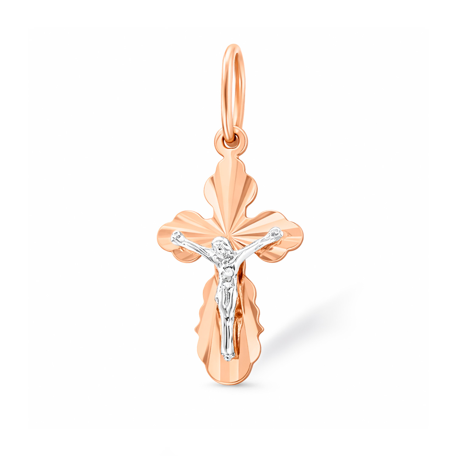 Zarter Kreuzanhänger mit Kruzifix aus 585er Rot- und Weißgold, mit Diamantenschliff, Höhe ≈ 21 mm.