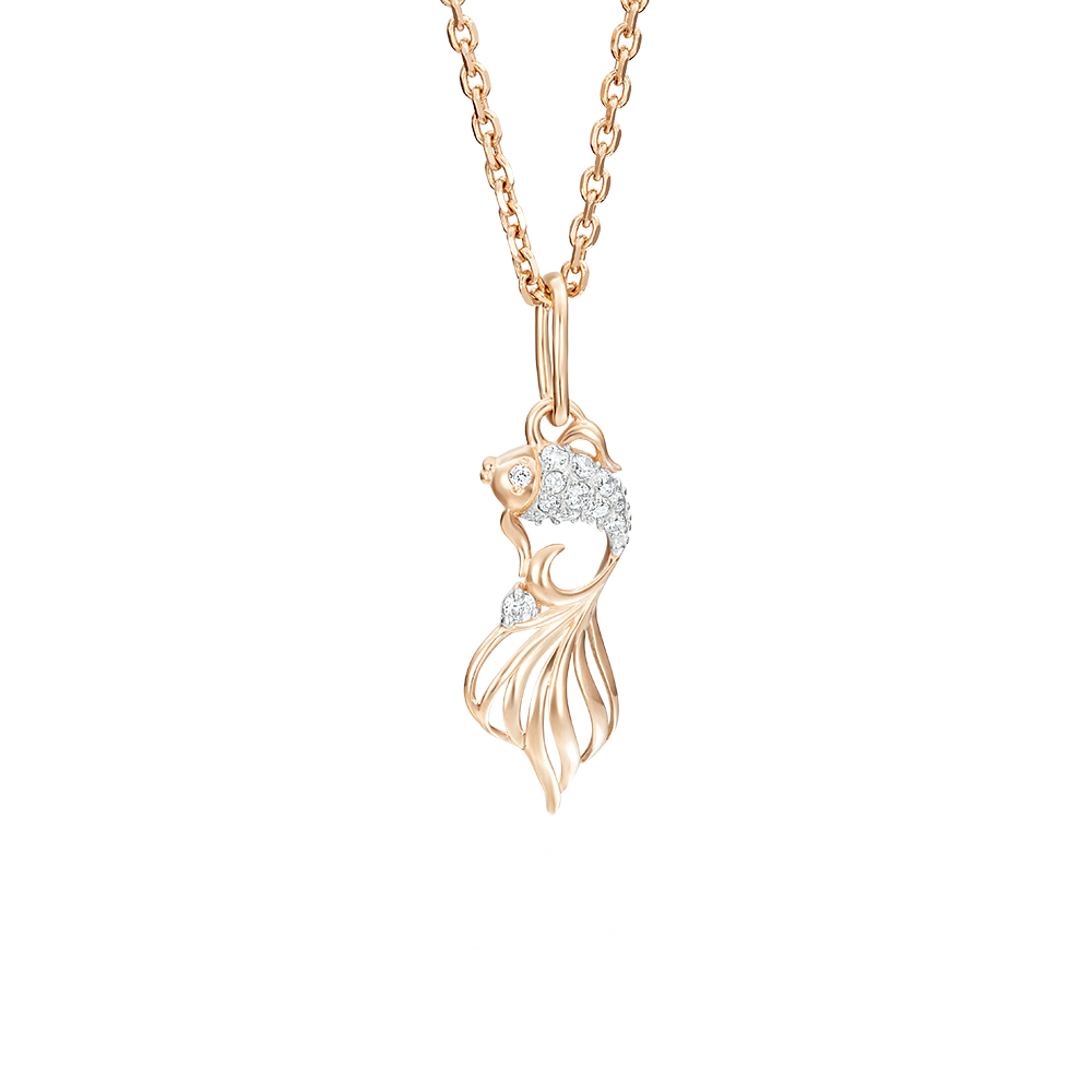 Dieser elegante Anhänger in Form eines Goldfisches ist aus 585er Rotgold gefertigt und mit funkelnden Zirkonia verziert – wie glitzernde Wassertropfen.