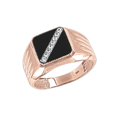 Ausdrucksstarker Herrenring aus 585er Rotgold, mit Onyx und Zirkonia, Gewicht ≈ 7,2g