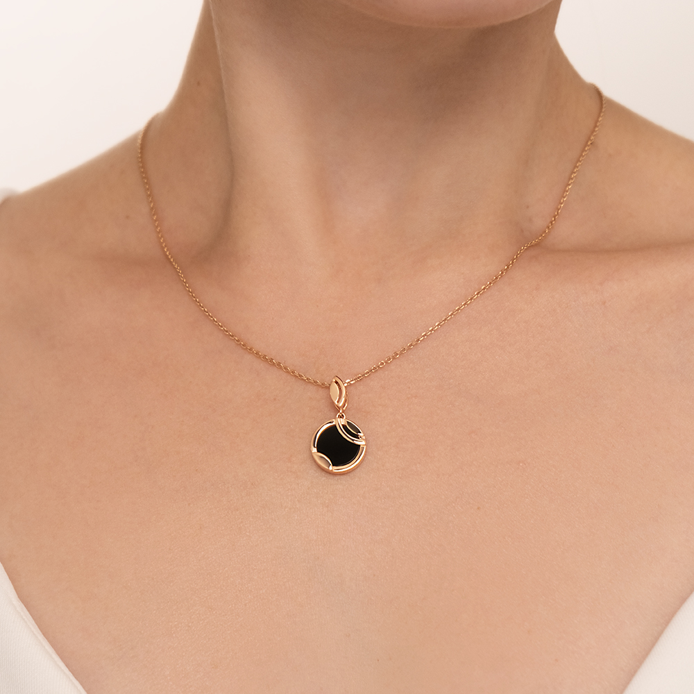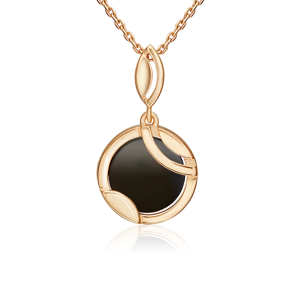 Dieser elegante Anhänger aus 585er Rotgold mit schwarzem Onix steht für innere Stärke und Harmonie. Die runde Onixfläche wird von geschwungenen Goldelementen eingerahmt, ein zarter Blattakzent an der Öse rundet das Design ab. Schwarzer Onix gilt seit Jahrhunderten als Schutzstein, der Selbstvertrauen und Klarheit schenkt. Ein stilvolles Schmuckstück mit Persönlichkeit — perfekt für jeden Tag und besondere Anlässe.In Kombination mit passenden Ohrringen (31 см - Art. 70830288 oder 20 cm - Art. 70830296) und Ring (Art. 70830292) entsteht ein vollendetes Set – für Frauen mit Sinn für Ästhetik und Ausdruck.