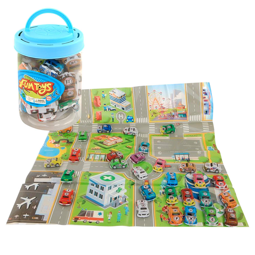 Autos in Trommel + Spielmatte 59x59cm, 31-teilig
