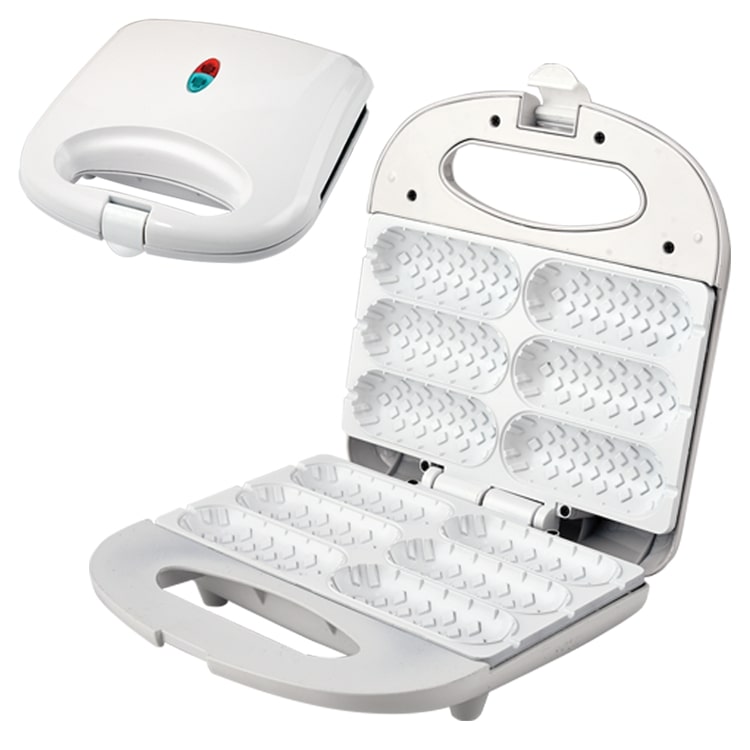 Im Inneren des Deckels und des Bodens befinden sich Rillen für Produkte. Mit diesem Wunderwerk der Technik kann man nicht nur heiße Würstchen kochen, sondern auch Waffeln oder kleine Stäbchen mit einem Döner.