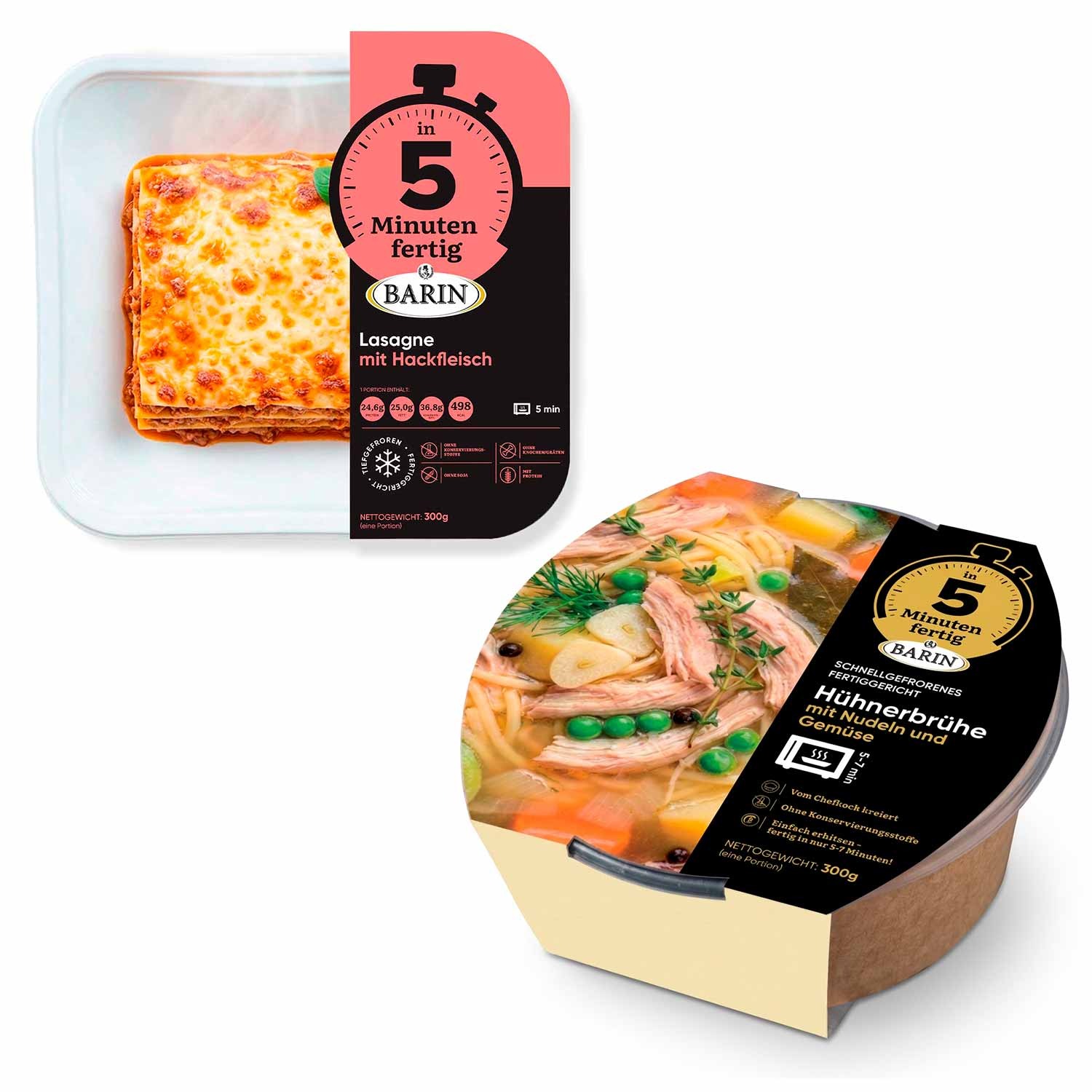 BARIN in 5 Minuten fertig Set „Leicht & vielseitig“: Hühnerbrühe mit Nudeln (300g) + Lasagne mit Hackfleisch (300g)