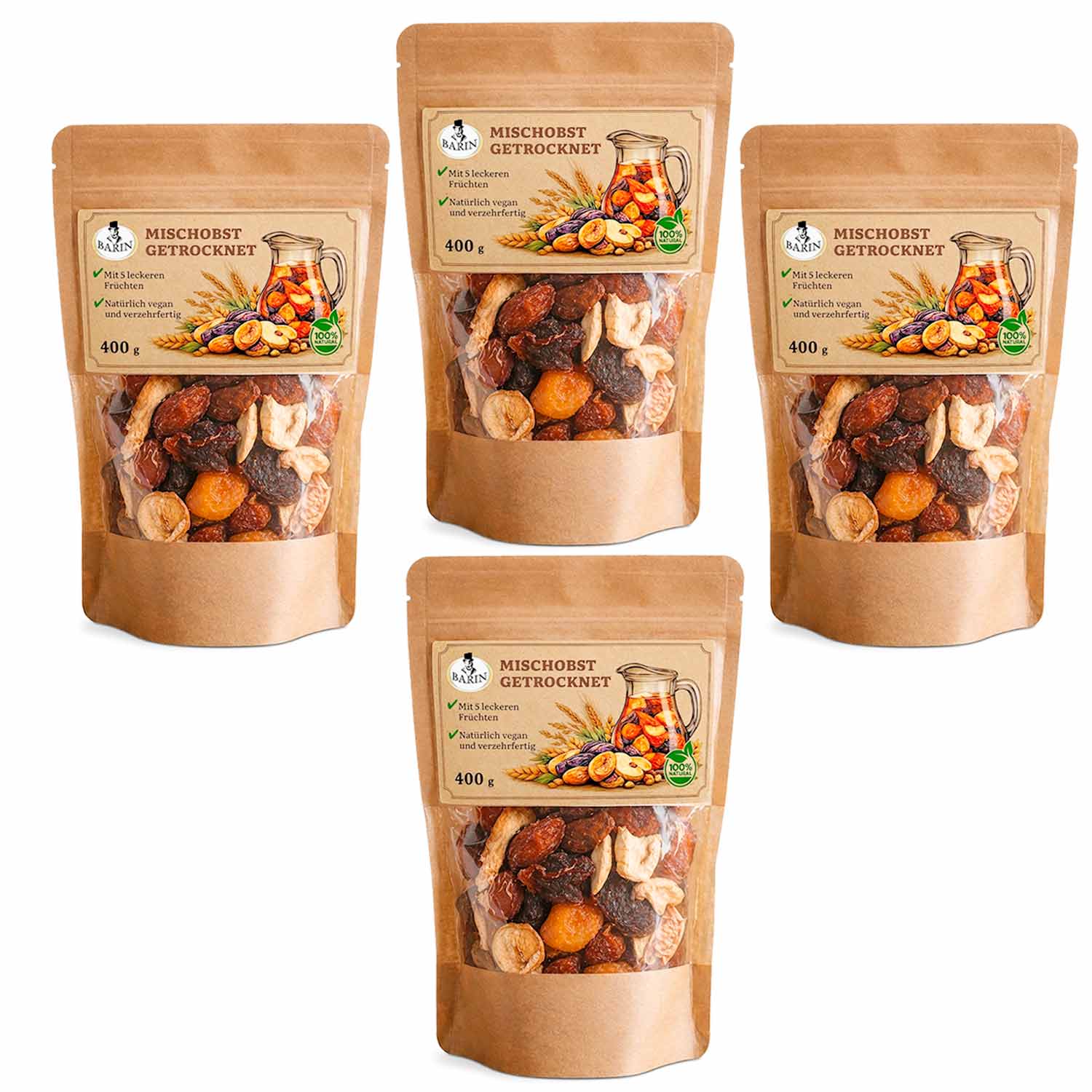 BARIN Omas Kompott aus Trockenfrüchten 3+1 Vorteilspack – Mischobst getrocknet aus Usbekistan, 4×400 g