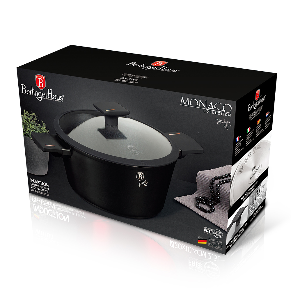 Berlinger Haus produziert spezialisierte, handgefertigte, einzigartige und innovative Produkte aus modernsten und hochwertigsten Materialien.Töpfe der Serie MONACO TITAN COLLECTION von BERLINGER HAUS bestehen aus hochwertigem Aluminium, das innen mit einer Titanbeschichtung mit sehr hohem Härtefaktor beschichtet ist. Außenbeschichtung in Mattschwarz und sind standardmäßig mit SOFT TOUCH-Griffen (Silikongriff) und Glasdeckeln mit Silikonrand für besseren Halt ausgestattet.