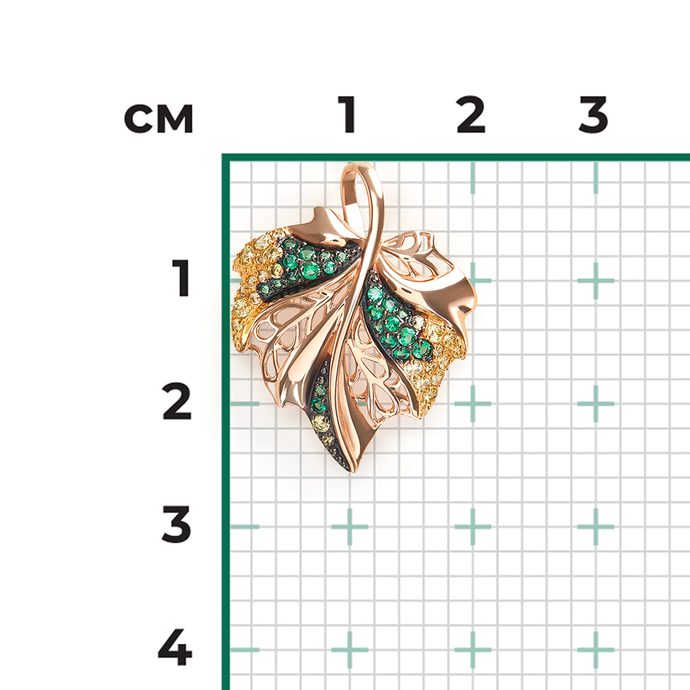 Ein exquisiter, blattförmiger Anhänger aus russischem Rotgold 585. Besetzt mit funkelnden Zirkonia in farblos, gelb und grün, die dem Schmuckstück Tiefe und Ausdruck verleihen. Höhe ca. 26 mm. Das elegante Design macht ihn zu einem besonderen Highlight jedes Outfits.Der Anhänger lässt sich ideal mit den passenden Ohrringen (Art. 70830265) und dem Ring (Art. 70830274) kombinieren und bildet so ein harmonisches Schmuckset.