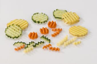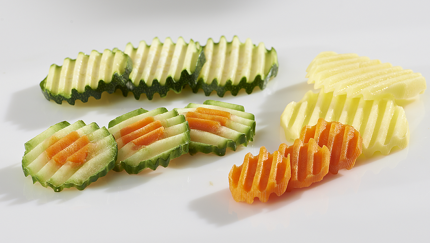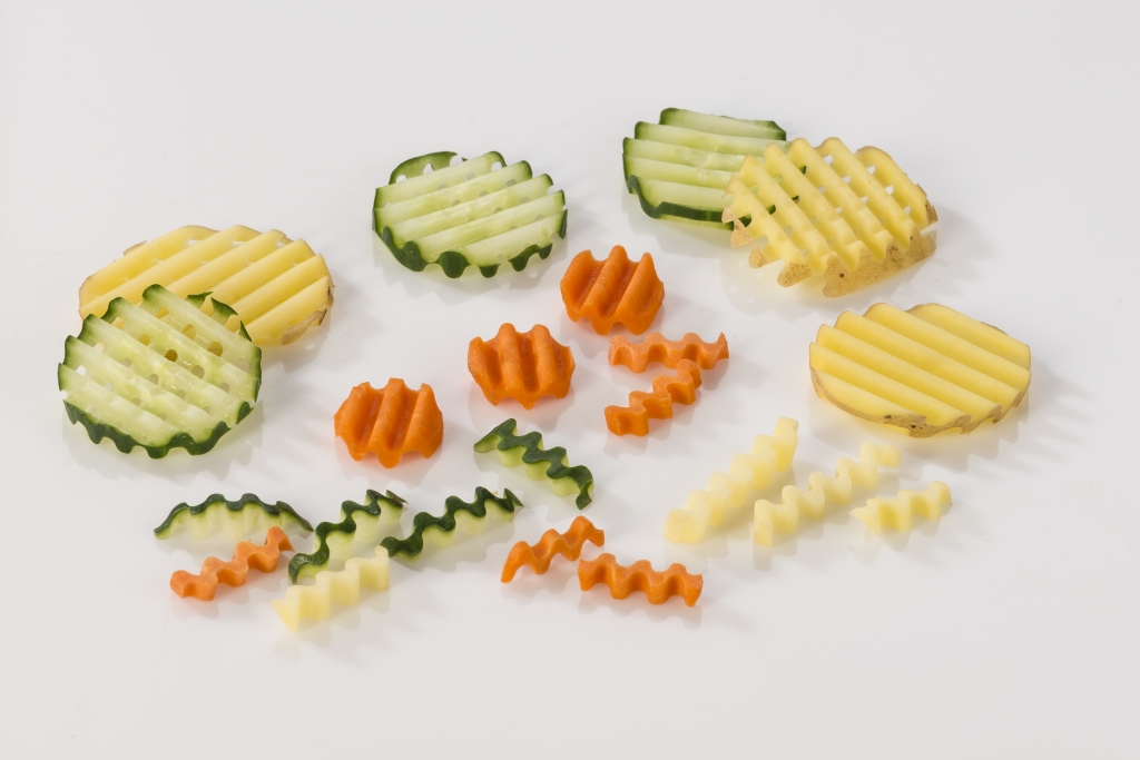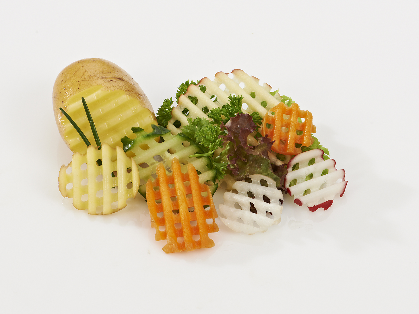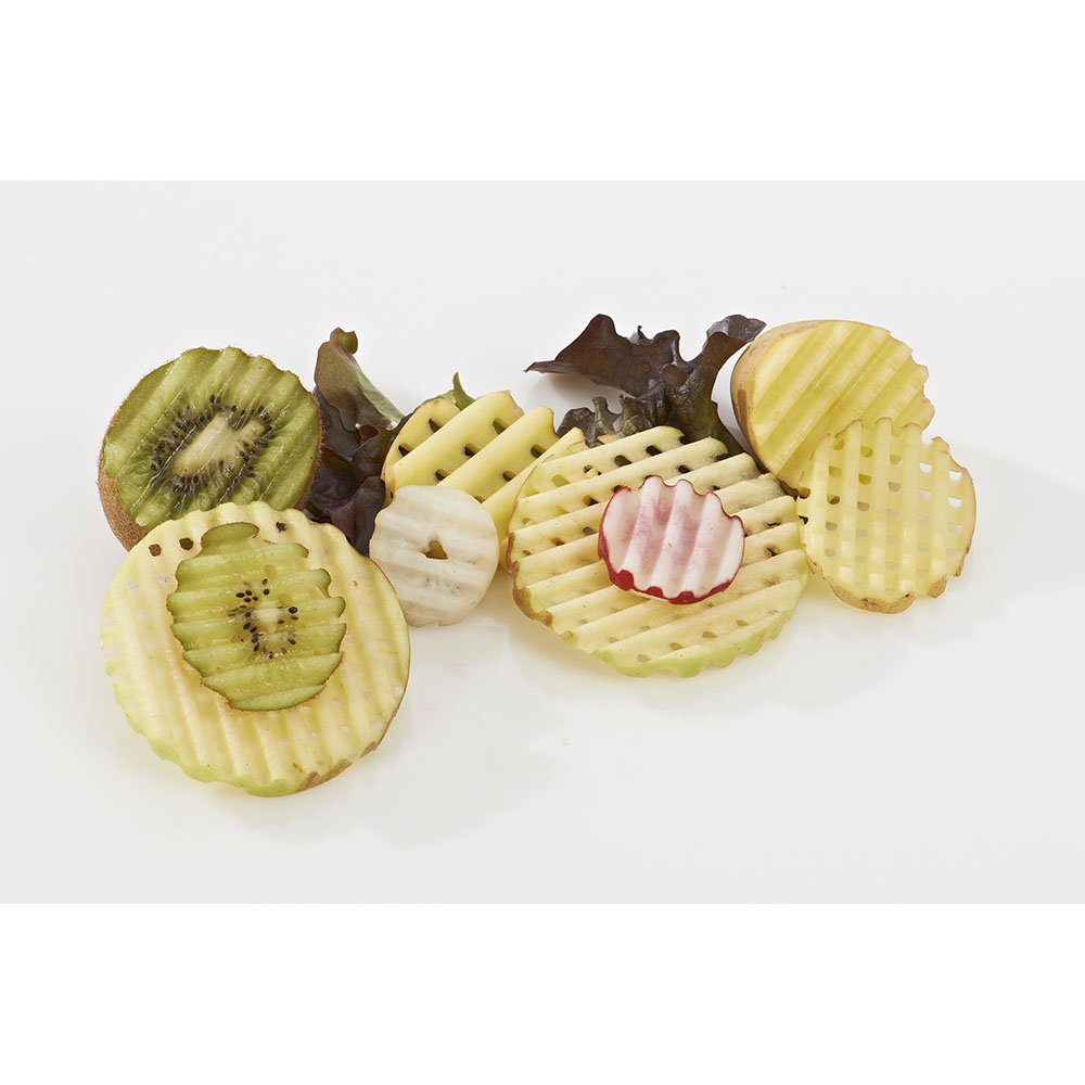 Multifunktionale und verblüffend ungewöhnliche Reibe. Dank der wellenförmigen Klinge, kann man Obst und Gemüse in Wellen oder Waffeln schneiden.Überraschen Sie Ihre Lieben mit Gerichten und Salaten im ungewöhnlichen Design.