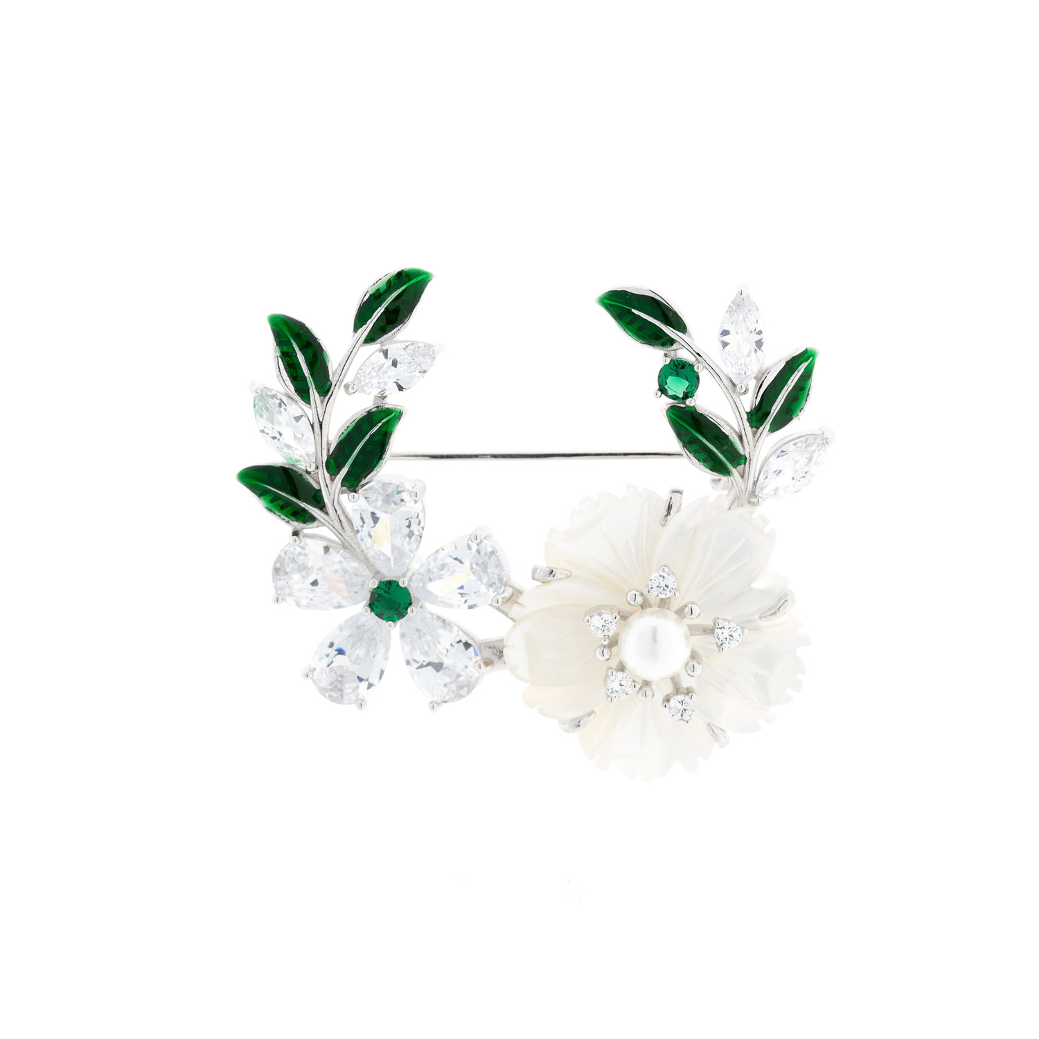 Die Brosche besticht durch ihr elegantes florales Design, das eine harmonische Kombination aus strahlenden Farben und funkelnden Elementen darstellt. Zwei filigrane Blumenmotive stehen im Mittelpunkt des Designs. Die größere Blüte besteht aus perlmuttähnlichem Material, verziert mit einer zarten Perle im Zentrum, umgeben von kleinen klaren Zirkonia-Steinen, die ihr zusätzlichen Glanz verleihen. Die kleinere Blüte ist aus silbernen Blättern gestaltet, die ebenfalls mit funkelnden Zirkonia-Steinen besetzt sind, wobei ein smaragdgrüner Stein die Mitte ziert.Zwei geschwungene Zweige mit grünen Blättern, die mit einem smaragdgrünen Glanz strahlen, rahmen die Blüten ein und verleihen der Brosche einen natürlichen und frischen Touch. Die Verwendung von glänzendem Silber, kombiniert mit den grünen und klaren Steinakzenten, schafft ein ausgewogenes und gleichzeitig luxuriöses Erscheinungsbild. Dieses Schmuckstück eignet sich ideal als edles Accessoire, um elegante Outfits zu vervollständigen.