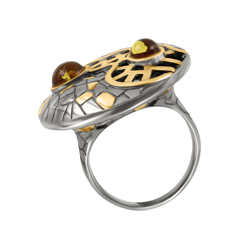 Zwei Bernsteine in warmen Honigtönen fangen das Licht ein und verleihen dem Ring eine sonnige Lebendigkeit.