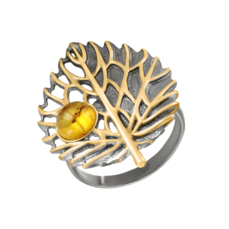 Im Zentrum des filigranen Blattes schimmert ein Bernstein in honiggelber Farbe, der wie ein Tautropfen auf einer goldenen Ader ruht.