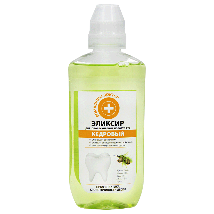 Das Elixier enthält Propolis und Zedernöl, medizinische Abkochungen aus Wegerich, Eichenrinde und Fingerkraut, die bei Zahnfleischbluten helfen. Darüber hinaus enthält das Produkt aktives Calcium, das aus Eierschalen gewonnen wird. Im Duett mit Fluorid helfen diese Komponenten, den Zahnschmelz zu stärken und seine Empfindlichkeit zu reduzieren.Eigenschaften: