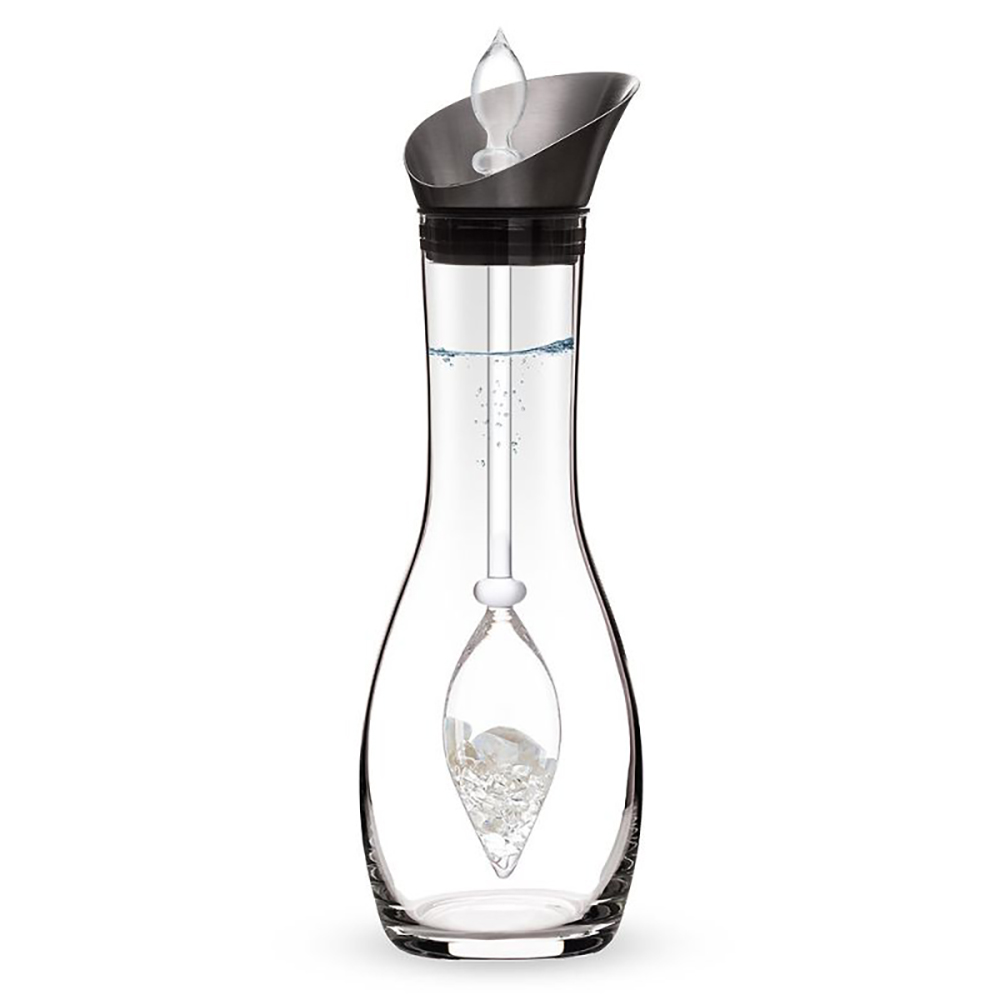 Der Gebrauch des era Sets ist kinderleicht: befestige die Edelsteinphiole einfach im Ausgießer der Karaffe und führe diese anschließend in die Karaffe ein. Die Phiole hängt sicher fixiert im Deckel, so dass sie später nicht an die Karaffenwand stoßen kann. Du kannst die Karaffe über den Ausgießer mit Trinkwasser füllen. Durch seine einzigartige Form kannst Du die Karaffe füllen und entleeren, ohne den Ausgießer dabei abzunehmen. Außerdem schützt er Dein Trinkwasser vor äußerlicher Verschmutzung.