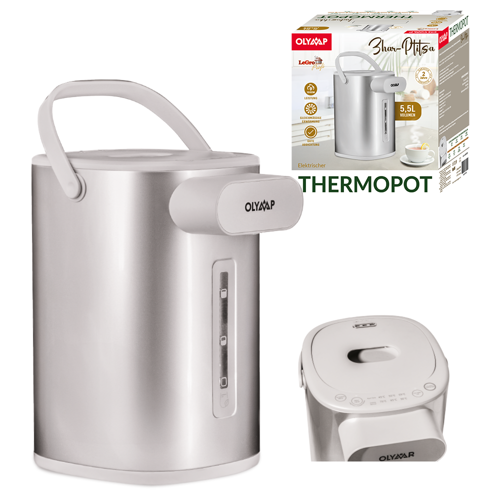 OLYMP Thermopot 5,5L – Die perfekte Kombination aus Leistung, Sicherheit und KomfortGenießen Sie jederzeit heißes Wasser nach Bedarf – ideal für Tee, Kaffee oder Babynahrung – dank der 1600W High-Speed-Erhitzung und intelligenter Temperaturregelung (45°C–90°C).