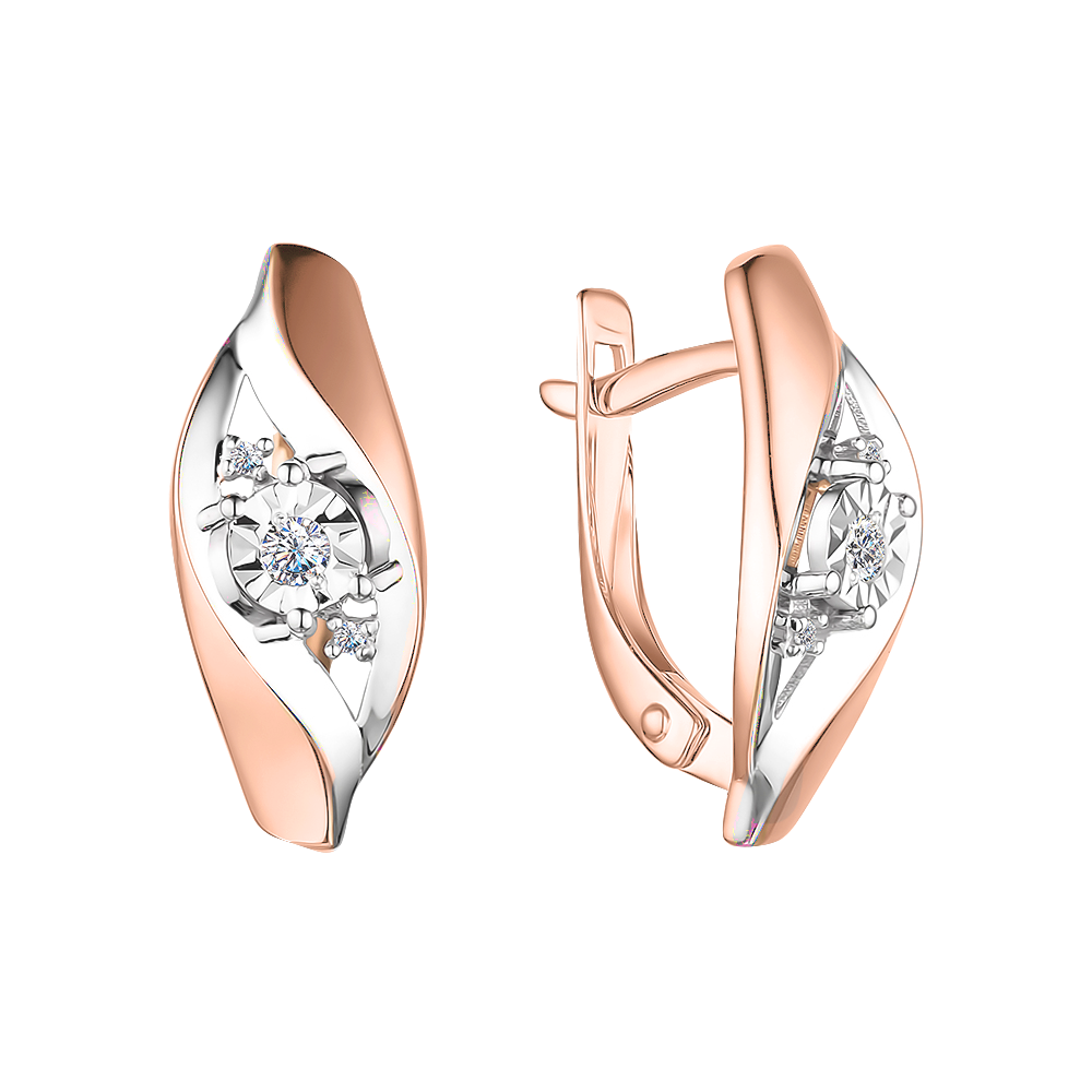 Wunderschöne Ohrringe aus 585er Rot- und Weißgold, mit je 3 Brillanten - mit einem Gewicht von 0,083 ct. HSI, englisches Schloss, Höhe ≈ 19 mm