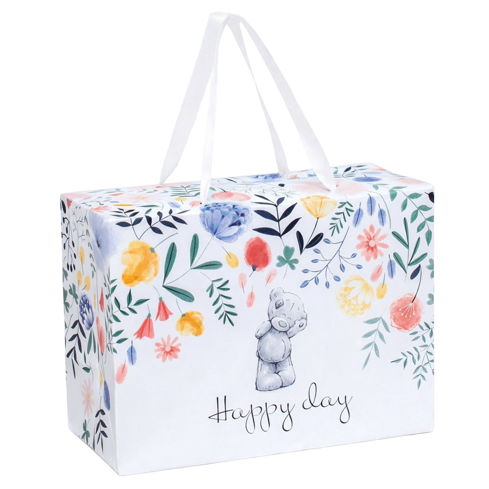 Die Geschenkbox „Happy Day“ überzeugt mit einem liebevollen, verspielten Design. Zarte Blumenillustrationen in Pastellfarben, kombiniert mit einem kleinen Teddybären-Motiv, verleihen der Box eine besonders warme und freundliche Ausstrahlung.Auf der Vorderseite befindet sich der Schriftzug: „Happy day“