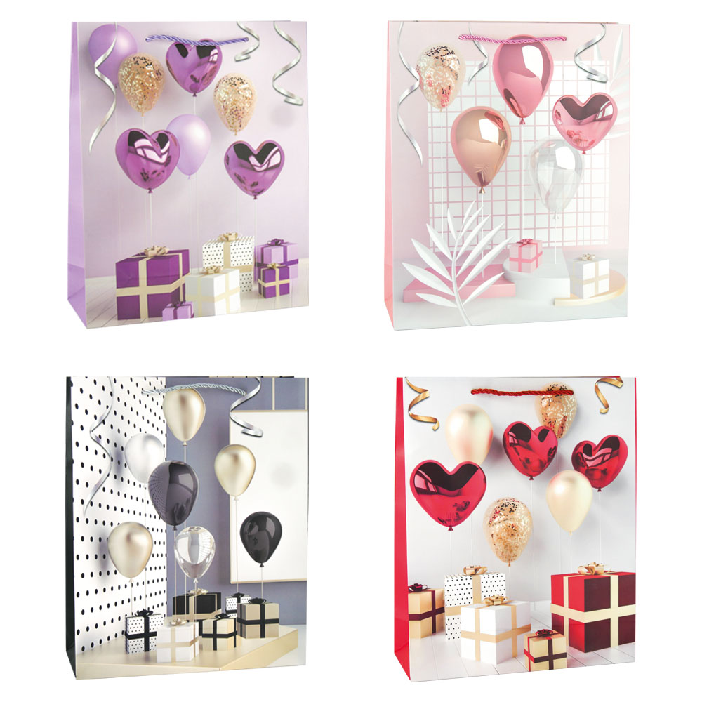 Geschenktaschen 12er Set, 26 x 32 x 10 cm – 4 Motive (Ballons & Geschenke)