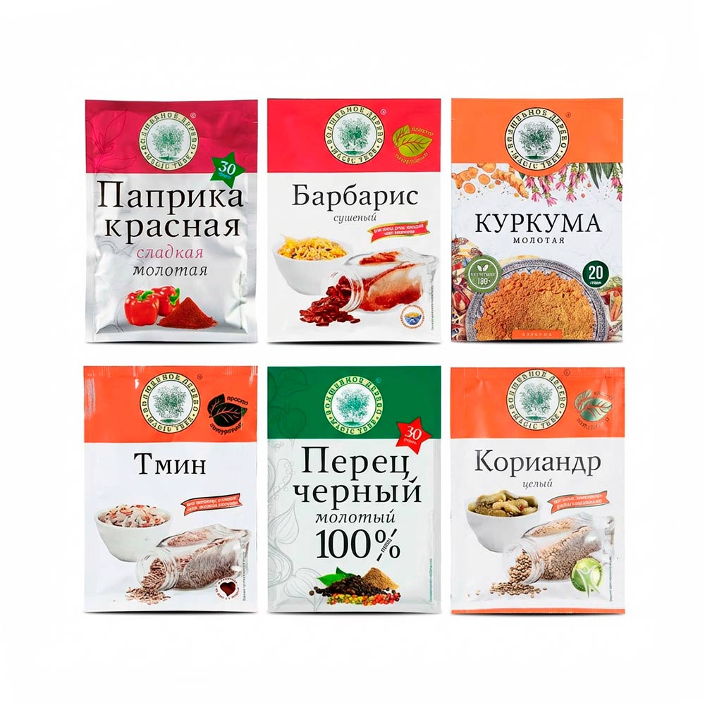 Dieses sorgfältig zusammengestellte Gewürz-Set für Plov von Magic Tree (Волшебное дерево) vereint die klassischen Gewürze der orientalischen Küche in separaten Einzelpackungen. So können Sie den Geschmack Ihres Plovs individuell steuern – genau so intensiv, ausgewogen oder würzig, wie Sie es lieben.Im Set enthalten sind: