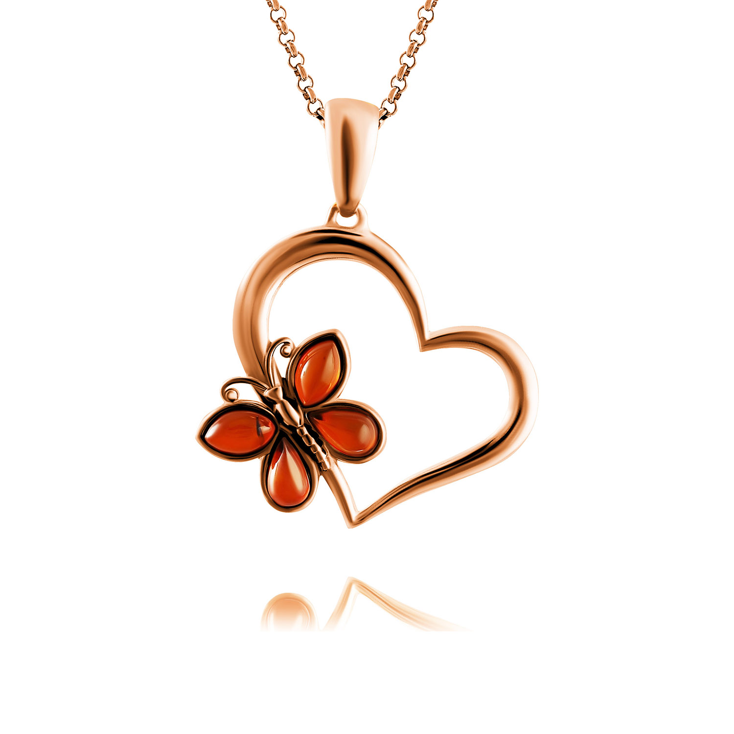 Herzanhänger aus vergoldetem 925er Silber mit integriertem Schmetterling aus cognacfarbenen Bernsteinen