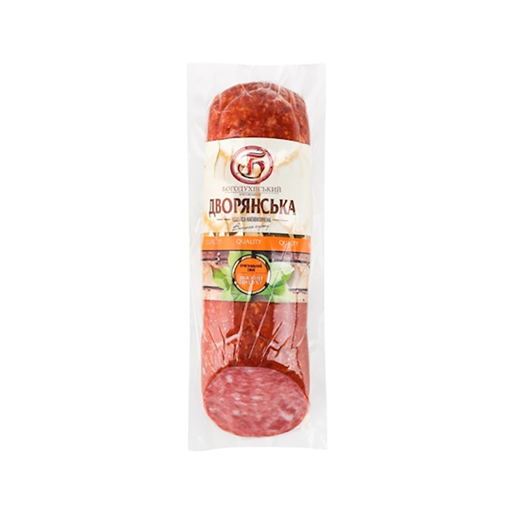 - Bogodukhivsky Salami „Dworjanskaja“ (ca. 400 g): Geräucherte Edelsalami mit kräftigem Geschmack – ideal für belegte Brote oder Käseplatten.