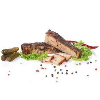 - Speck „Belorusskoe“ mit Pfeffer (ca. 330 g) – würzig-pikant mit aromatischem Pfeffer.