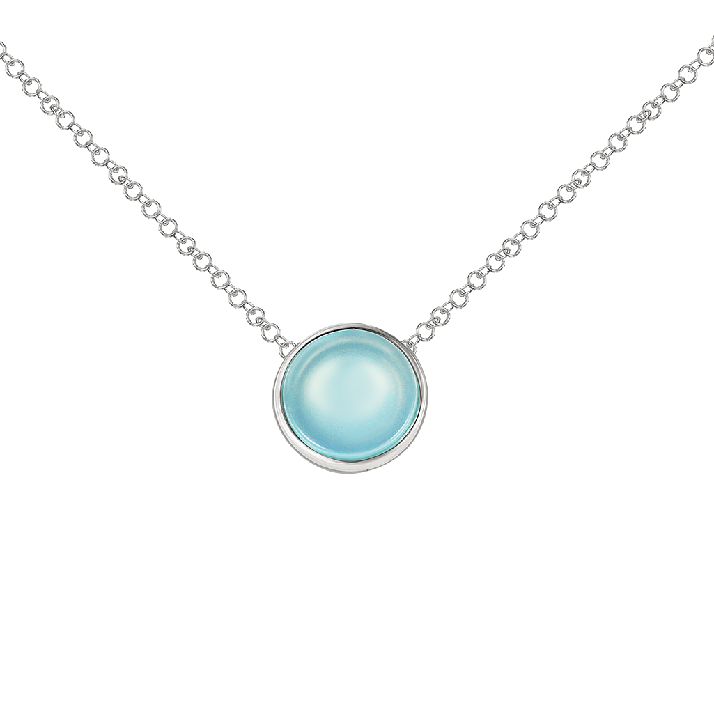 Der sanft schimmernde Aqua-Achat im runden Cabochon-Schliff fasziniert durch seine weiche, fast aquatische Farbe, die Ruhe und Leichtigkeit vermittelt.