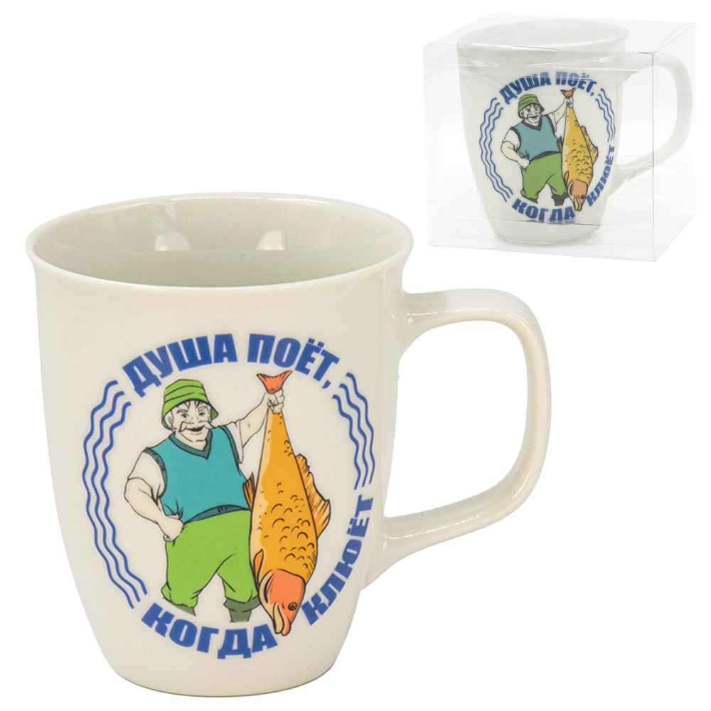 Eigenschaften:- Porzellantasse mit einem lustigen Spruch in Russisch: Die Seele singt, wenn der Fisch beißt / Душа поет, когда клюет .