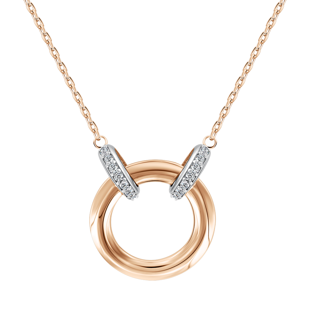 Stilvolle Halskette mit Anhänger aus russischem Rotgold 585 – ein Schmuckstück, das Eleganz und modernen Geschmack perfekt vereint. Die Kettenlänge ist verstellbar (ca. 44–49 cm) und sorgt für hohen Tragekomfort. Der Anhänger in Form eines Rings (Durchmesser ca. 15 mm) begeistert durch die harmonische Kombination von warm glänzendem Rotgold und funkelnden Zirkonia. Besondere Akzente setzen die dekorativen Elemente aus Weißgold, die mit Zirkonia besetzt sind und dem Anhänger einen raffinierten, modernen Charakter verleihen.Das klare, elegante Design macht die Kette zu einem vielseitigen Begleiter für den Alltag ebenso wie für festliche Anlässe.