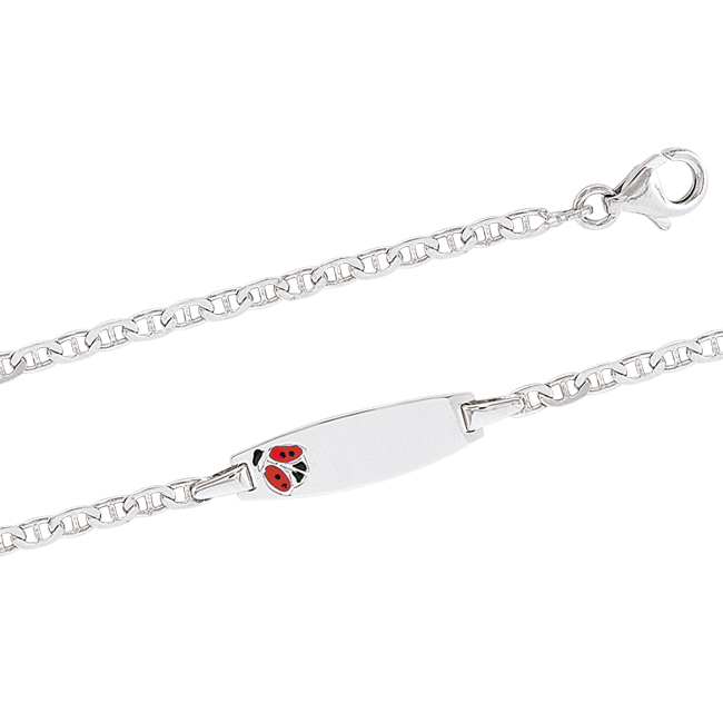 Ein Armband mit dieser Art von Flechtwerk, das in jedem Glied einen verstärkenden Jumper hat, wird „Sea Anchor“ oder „Meereskette“ genannt. Es gilt als das zuverlässigste und haltbarste Modell.Das klassische Kettenarmband ist mit einer Platte verziert, auf der ein Marienkäfer aus Emaille abgebildet ist. Wenn gewünscht, kann jeder Name des Kindes oder Inschriften auf der Platte eingravieren.