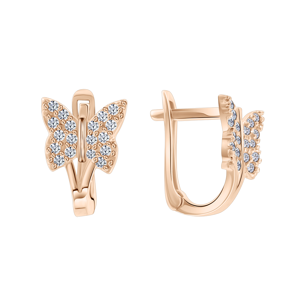 Süße Kinderohrringe Schmetterling aus 585er Rotgold, mit Zirkonia, englischer Verschluss, Höhe ≈ 11 mm.