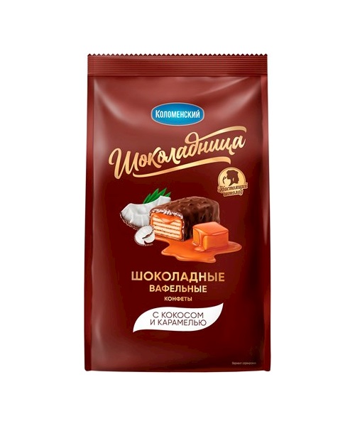 Genießen Sie das exklusive Waffelkonfekt "Schokoladnitsa" von der traditionsreichen Kolomenski Manufaktur – eine harmonische Kombination aus knusprigen Waffelschichten, zartschmelzender Schokolade, aromatischem Kokosraspel und fließender Karamellfüllung. Diese handwerklich gefertigten Konfektstücke überzeugen durch ihr einzigartiges Geschmacksspiel aus tropischer Süße und buttrigem Karamell.- Hochwertige Zutaten – Alkalisierter Kakao, echte Karamellfüllung & feinste Kokosraspel