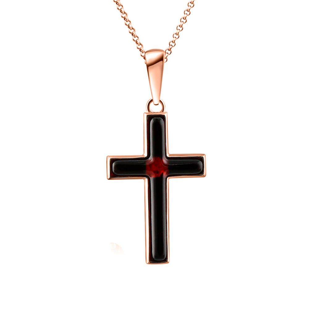 Dieser elegante Kreuzanhänger aus 925er Silber, veredelt mit edler Rosévergoldung, vereint Spiritualität und modernen Stil. Die Mitte des Kreuzes ist mit einem natürlichen Bernstein in tiefem Rot-Schwarz-Ton besetzt, der bei Lichteinfall geheimnisvoll schimmert.Das klassische Kreuzdesign wird durch die warme Ausstrahlung des Bernsteins neu interpretiert – ein Schmuckstück, das sowohl als Ausdruck des Glaubens als auch als modisches Accessoire überzeugt. Perfekt geeignet für festliche Anlässe oder den Alltag.