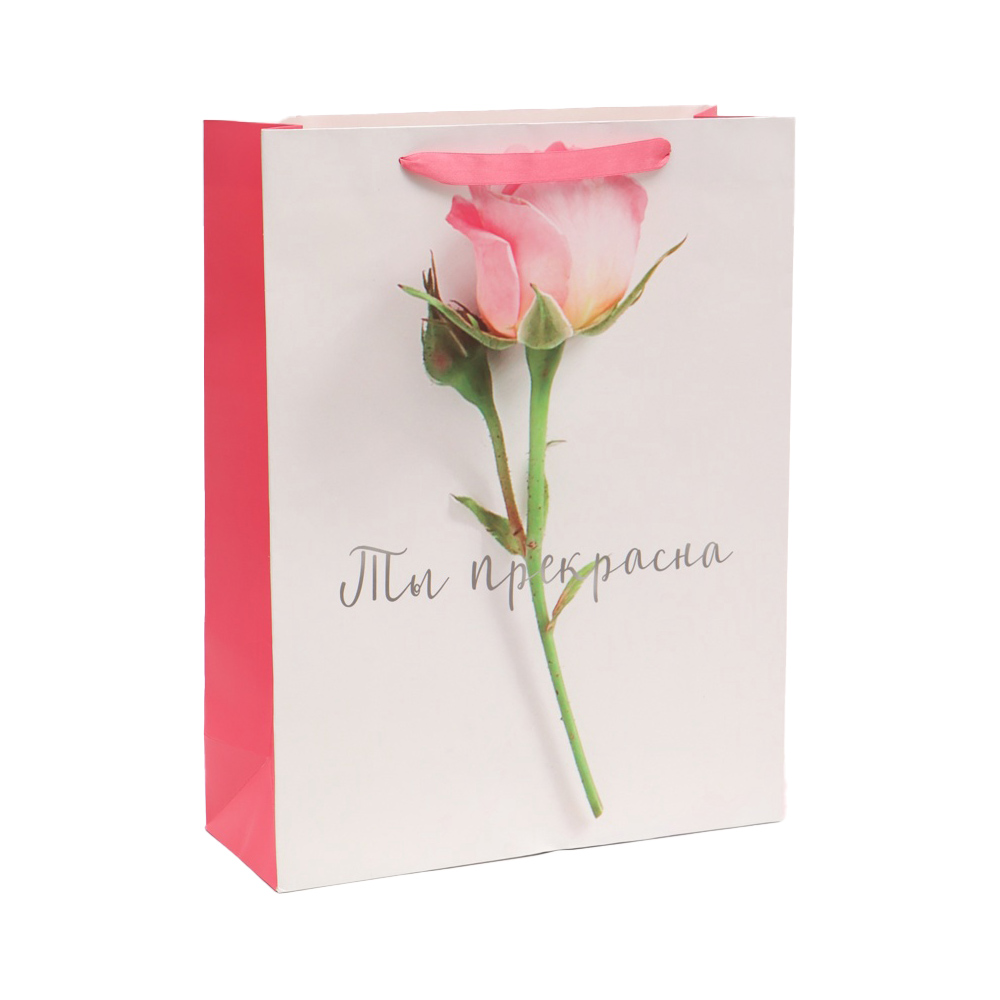 Die laminierte Geschenktasche „Du bist wunderschön“ überzeugt mit einem eleganten und minimalistischen Design. Eine zarte rosafarbene Rose auf hellem Hintergrund symbolisiert Wertschätzung, Liebe und Bewunderung. Die Kombination aus sanften Farben und moderner Typografie verleiht der Tasche eine besonders stilvolle Ausstrahlung.Auf der Vorderseite befindet sich die Aufschrift: „Ты прекрасна“ („Du bist wunderschön“)