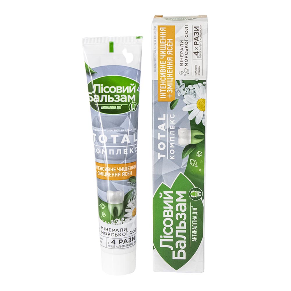 Die Zahnpasta Lesnoy Balsam TOTAL Complex enthält Meersalz, Kamillenextrakt und Kräuterabkochung.Verwenden Sie die Zahnpasta zusammen mit der TOTAL Complex Spülung von Lesnoy Balsam für eine maximale Wirkung.