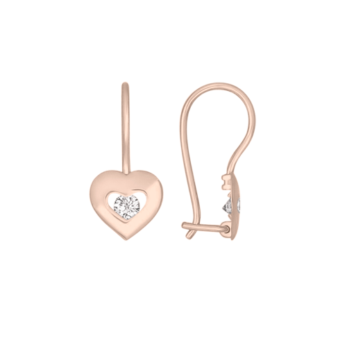 Zarte Kinderohrringe in Herzform aus 585er Rotgold, mit Zirkonia, Höhe ≈ 15 mm.