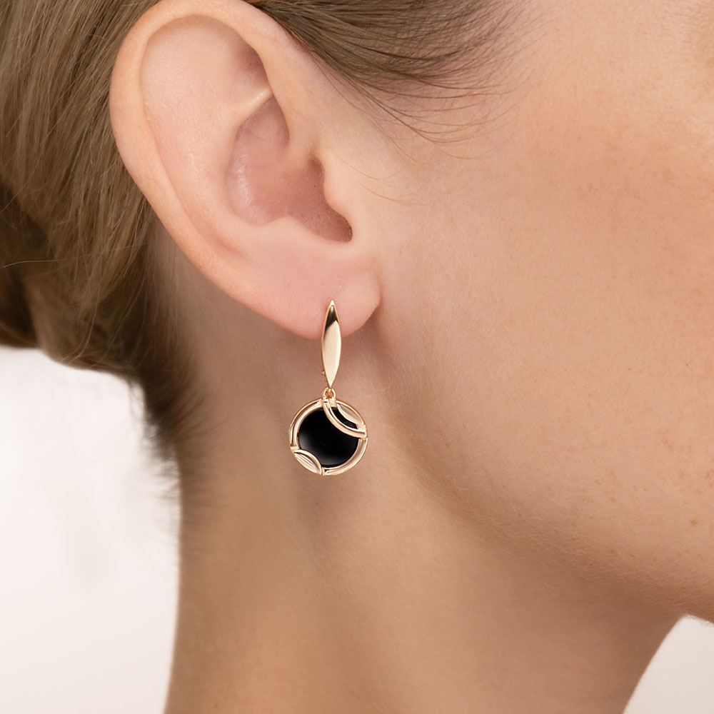 Diese langen Ohrhänger aus 585er Rotgold verkörpern moderne Eleganz. Der tiefschwarze Onix ist von sanften, geometrischen Goldformen umrahmt. Die Länge von ca. 31 mm und der sichere englische Verschluss machen sie zum stilvollen Begleiter für jeden Anlass. Die Kombination aus Gold und Schwarz steht für Stärke, Balance und zeitlose Raffinesse. Die verlängerte Form betont die Konturen des Gesichts und verleiht dem Look feminine Leichtigkeit. Onix gilt seit jeher als Schutzstein starker Persönlichkeiten.Kombinieren Sie die Ohrhänger mit dem passenden Ring (Art. 70830292) und Anhänger (Art. 70830291) – für ein harmonisches Gesamtbild.