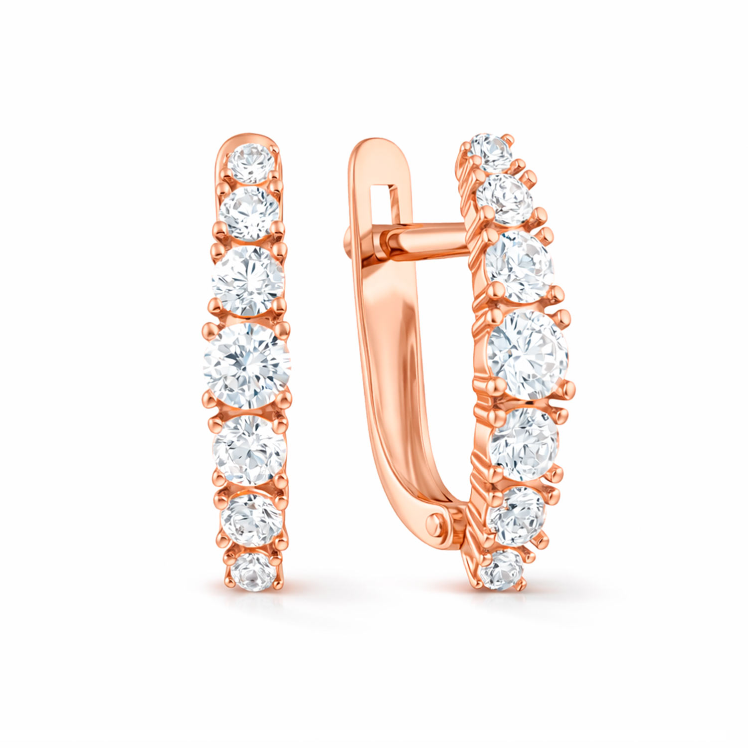 Diese bezaubernden Ohrringe aus russischem 585er Rotgold mit jeweils 7 Zirkonia sind das Inbild von zarter Schönheit und Eleganz. Mit einer Höhe von ca. 15 mm zeichnen sie sich durch ein außergewöhnlich schönes Design aus, bei dem die Zirkonia-Steine die Hauptrolle spielen und das edle Metall als zarte Basis dient. Die Steine sind in unterschiedlichen Größen, harmonieren jedoch perfekt miteinander und ergänzen sich. Die Zirkonia-Reihe verzaubert mit ihrem Glanz im Licht und funkelt in lebendigen Flashes.